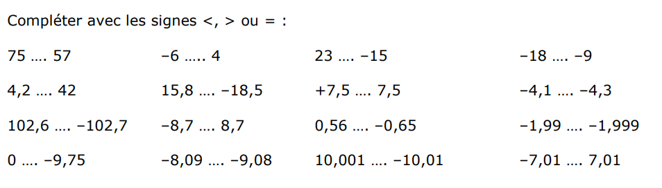 Exercice 8 – comparaison de nombres relatifs.